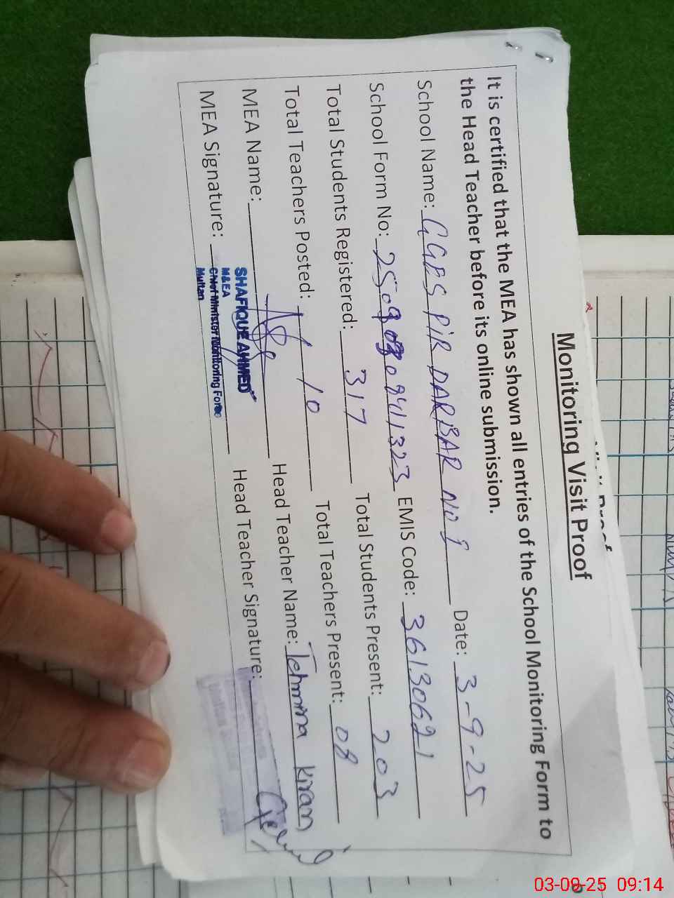 | EMIS Code: 36130621 | Name of School: GGES PIR DARBAR NO 1 MULTAN | |||
