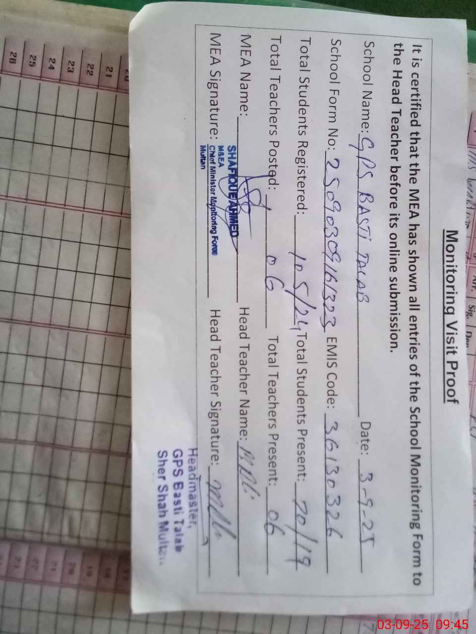 | Attendance Register | Head Teacher | MEA with School | Visit Proof |