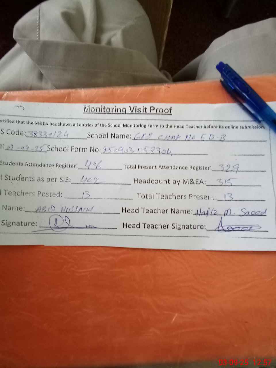 | Attendance Register | Head Teacher | MEA with School | Visit Proof |