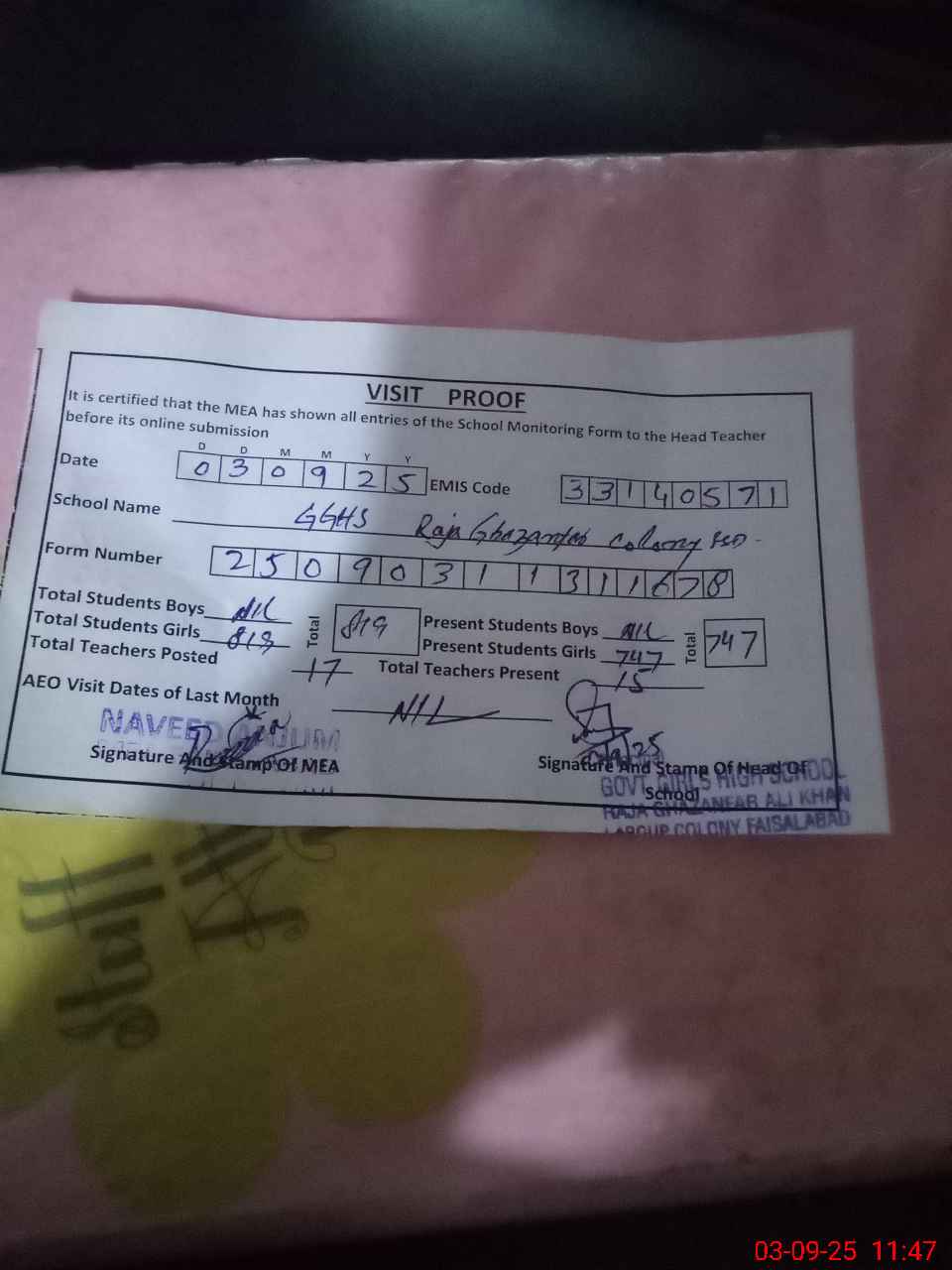 | EMIS Code: 33140571 | Name of School: GGHS RAJA GAZANFAR COLONY FAISALABAD | |||