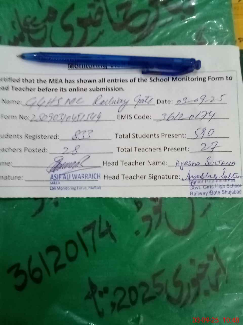 | EMIS Code: 36120174 | Name of School: GGHS MC RAILWAY GATE SHUJABAD | |||