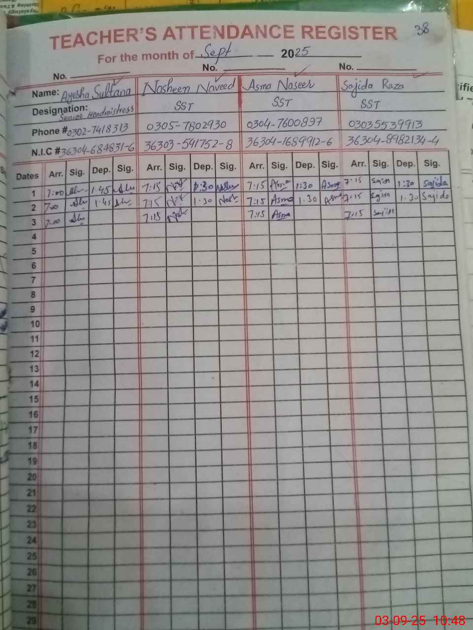 | Name: AY**** SU**** Designation: (School Headmaster's/Headmistress's) SNR HEAD MISTRESS Phone/Cell Number: 03**** |