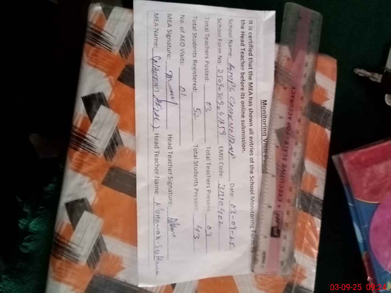 | Name: MU**** SU**** Designation: (School Headmaster's/Headmistress's) PST Phone/Cell Number: 03**** |