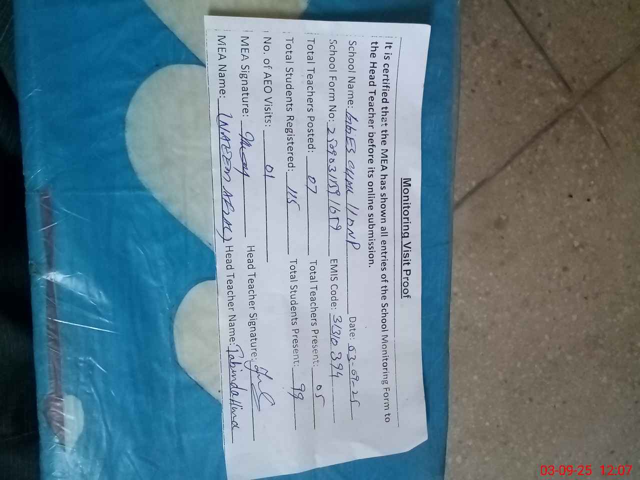 | Attendance Register | Head Teacher | MEA with School | Visit Proof |