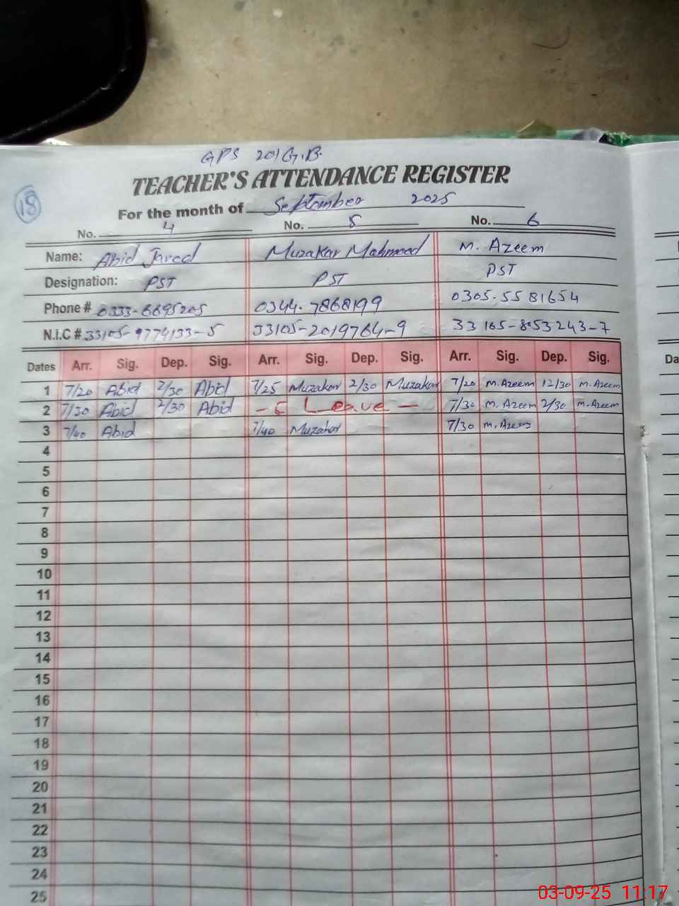 | CNIC | Full Name | Designation | R/C | Absence during last cal. month |