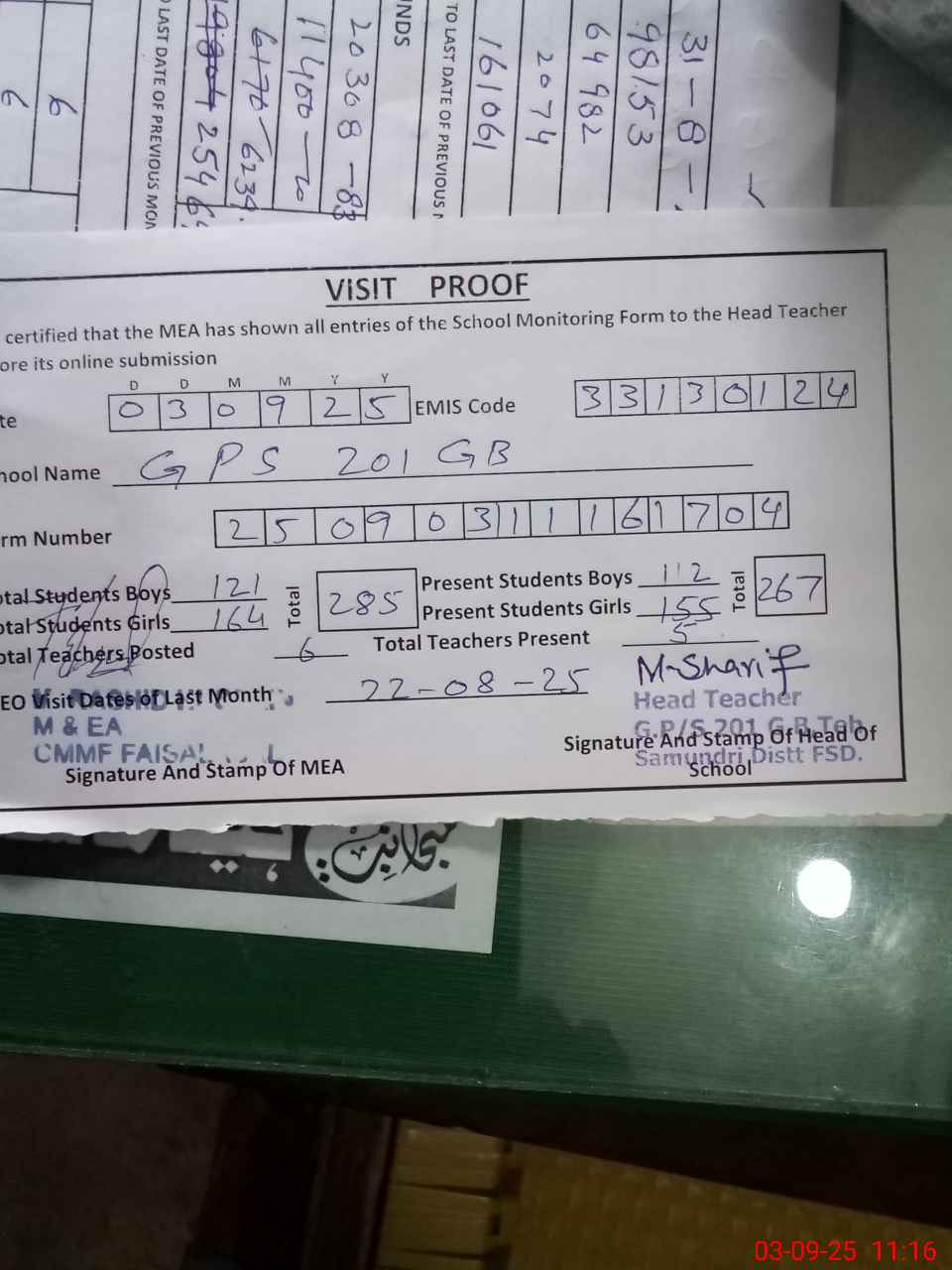 | Attendance Register | Head Teacher | MEA with School | Visit Proof |