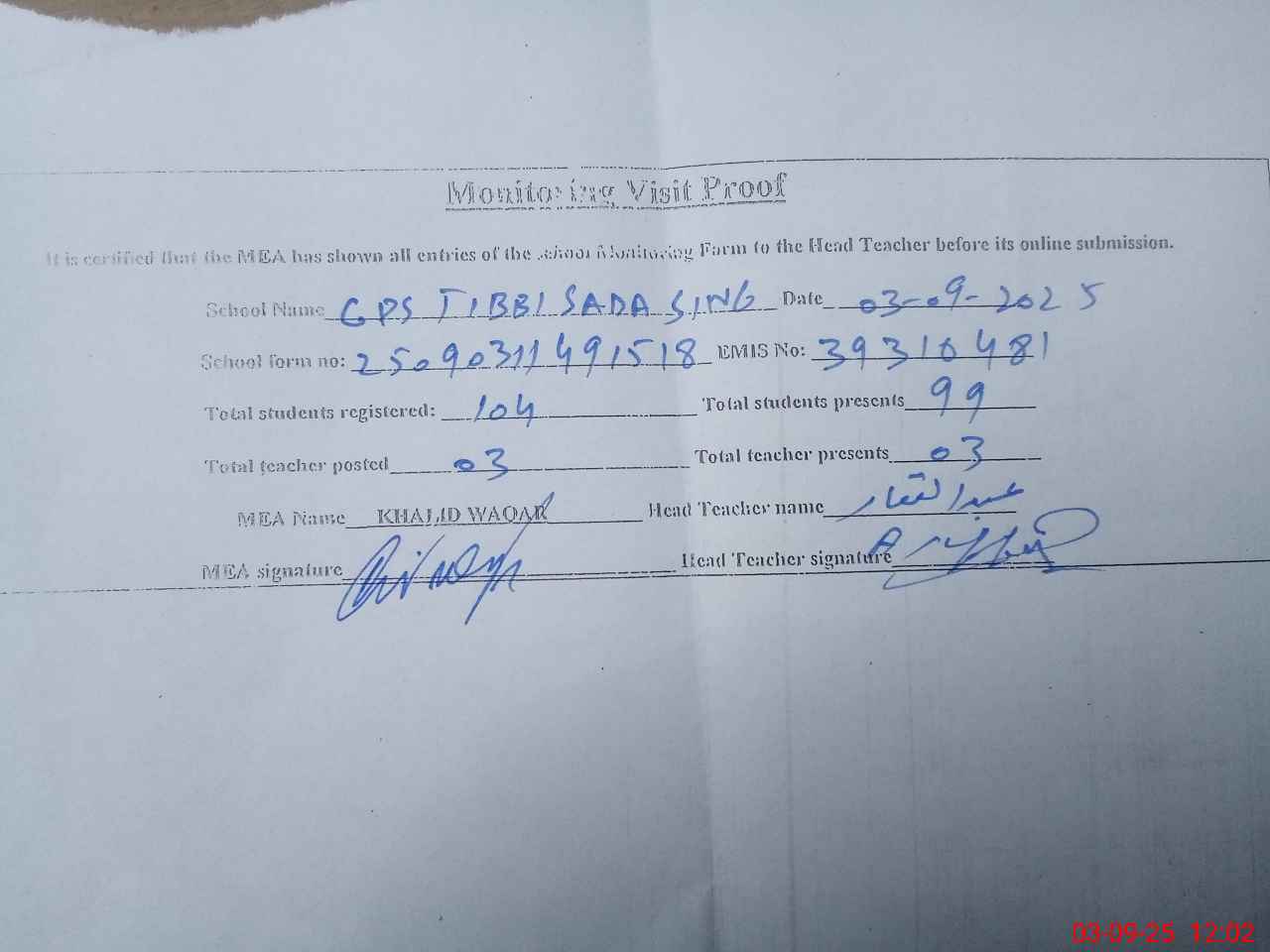 | Attendance Register | Head Teacher | MEA with School | Visit Proof |