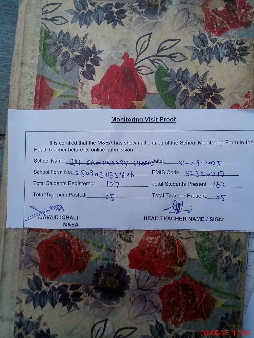 | Attendance Register | Head Teacher | MEA with School | Visit Proof |