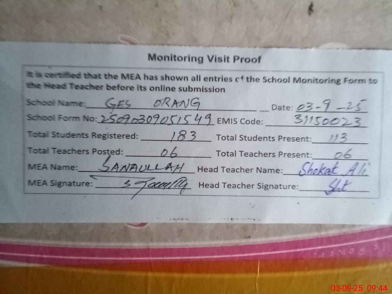 | EMIS Code: 31150023 | Name of School: GES ORRANG | |||