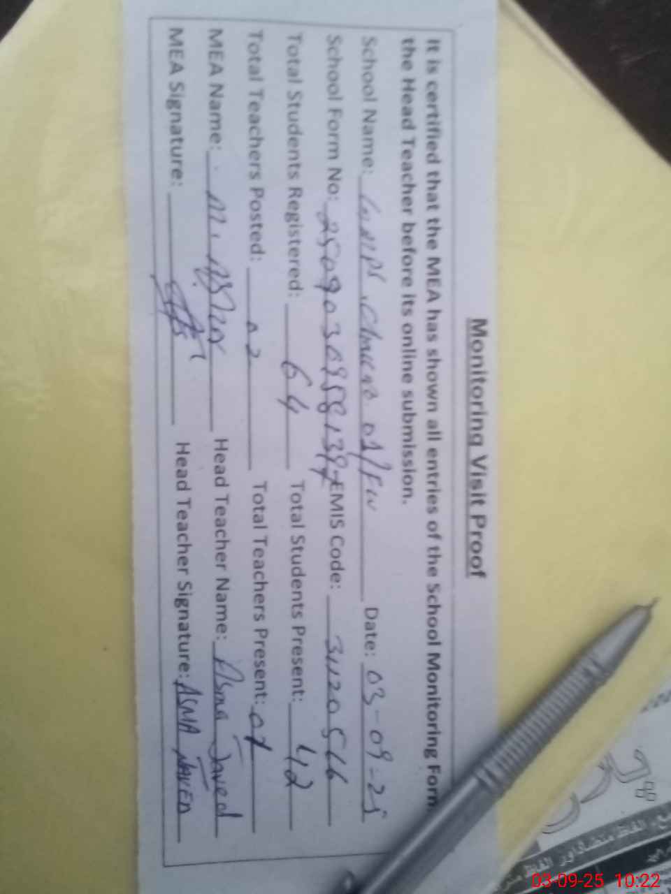 | Attendance Register | Head Teacher | MEA with School | Visit Proof |