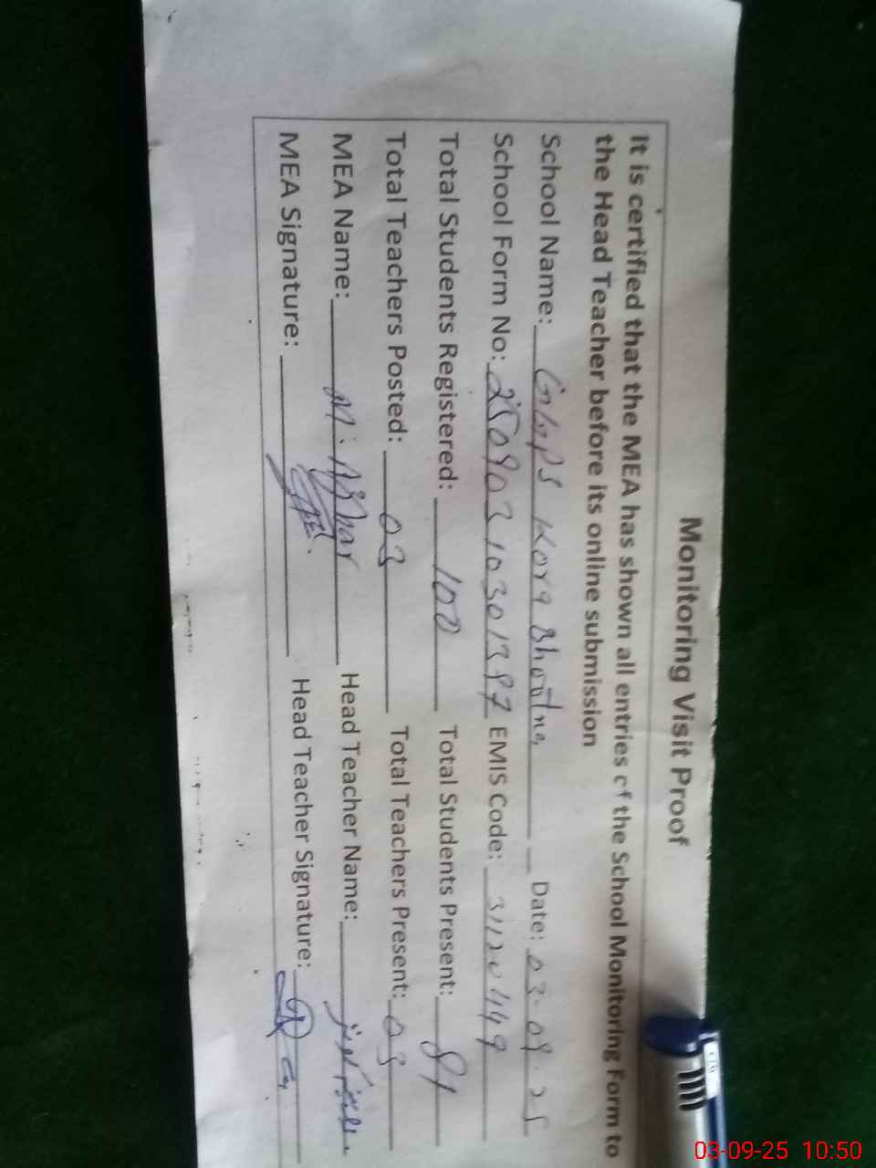 | Attendance Register | Head Teacher | MEA with School | Visit Proof |