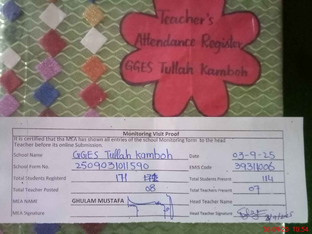 | Attendance Register | Head Teacher | MEA with School | Visit Proof |