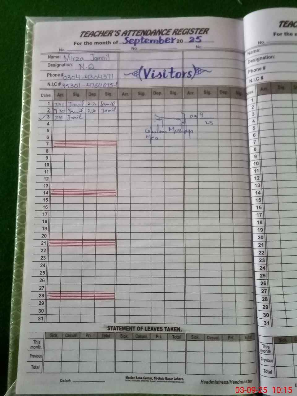 | CNIC | Full Name | Designation | R/C | Absence During Last Calender Month |