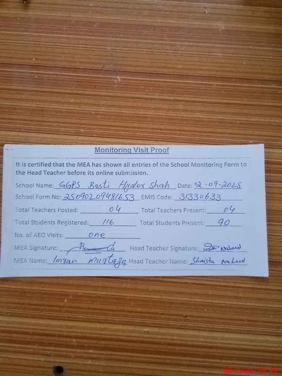 | EMIS Code: 31330633 | Name of School: GGPS BASTI HYDER SHAH | |||