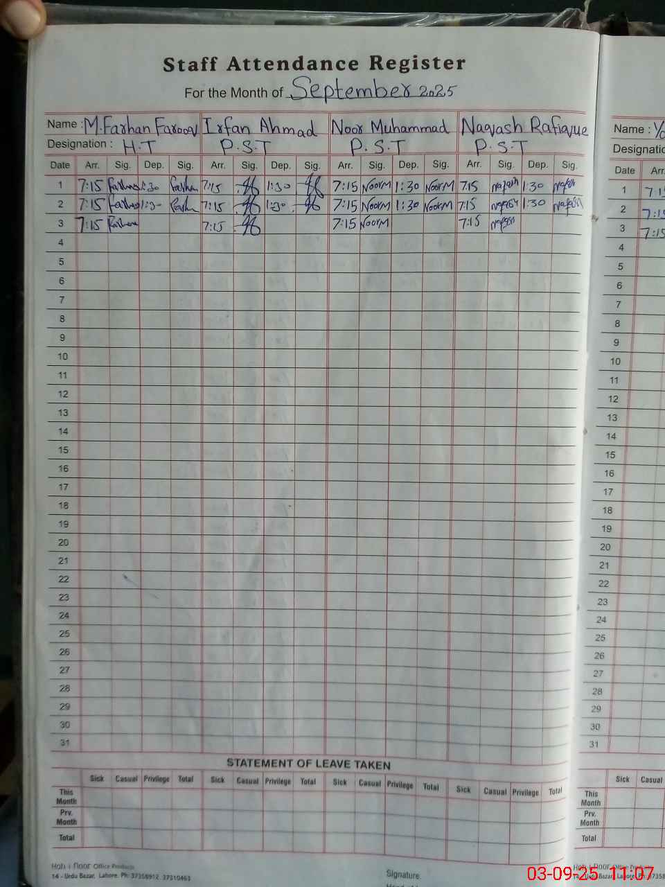 | CNIC | Full Name | Designation | R/C | Absence During Last Calender Month |
