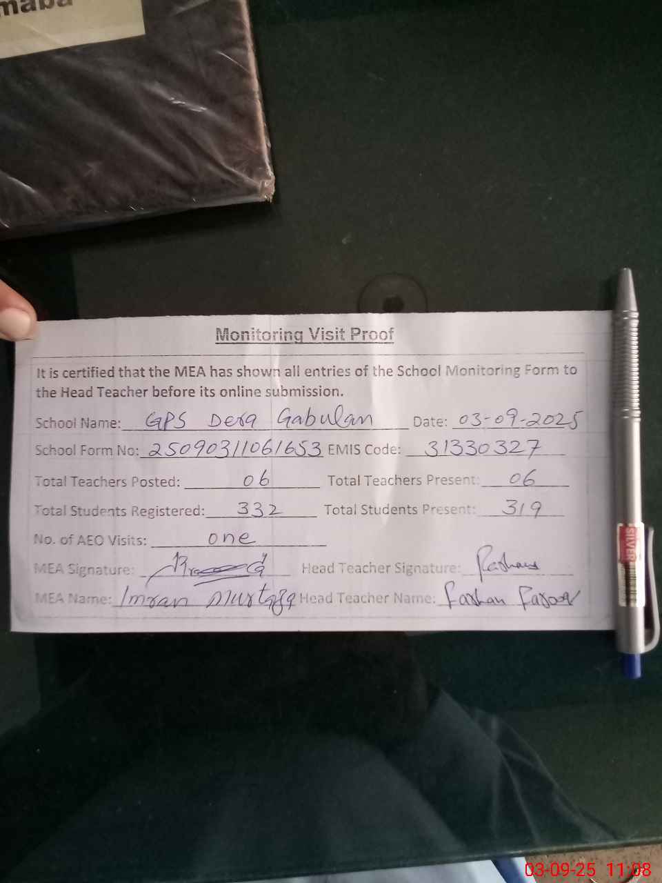 | Attendance Register | Head Teacher | MEA with School | Visit Proof |