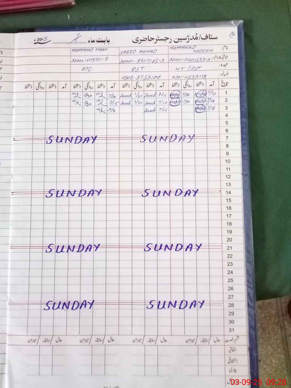 | CNIC | Full Name | Designation | R/C | Absence During Last Calender Month |