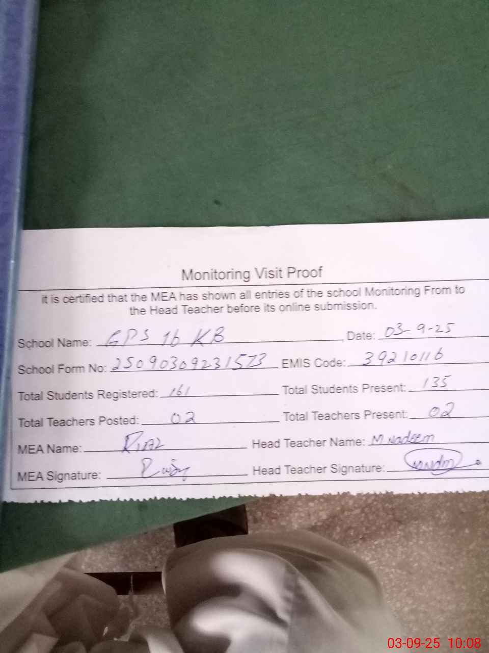 | Attendance Register | Head Teacher | MEA with School | Visit Proof |