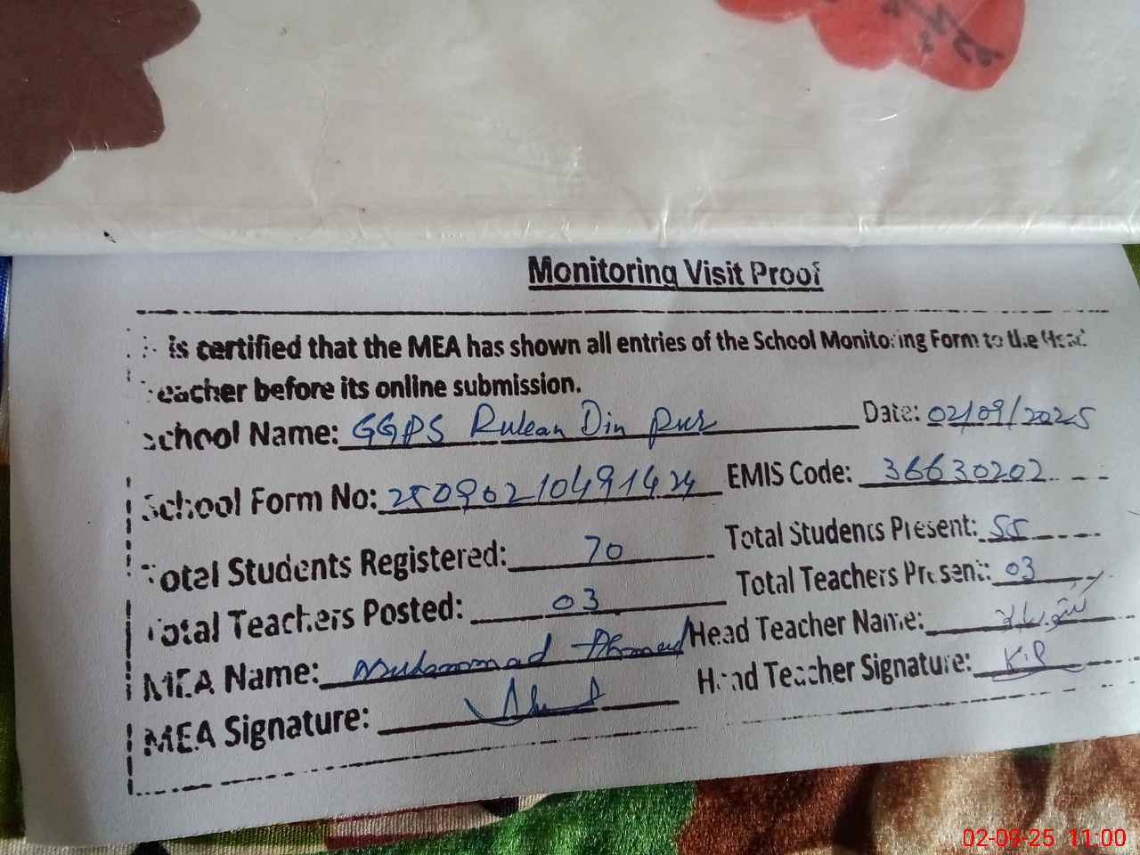 | Attendance Register | Head Teacher | MEA with School | Visit Proof |