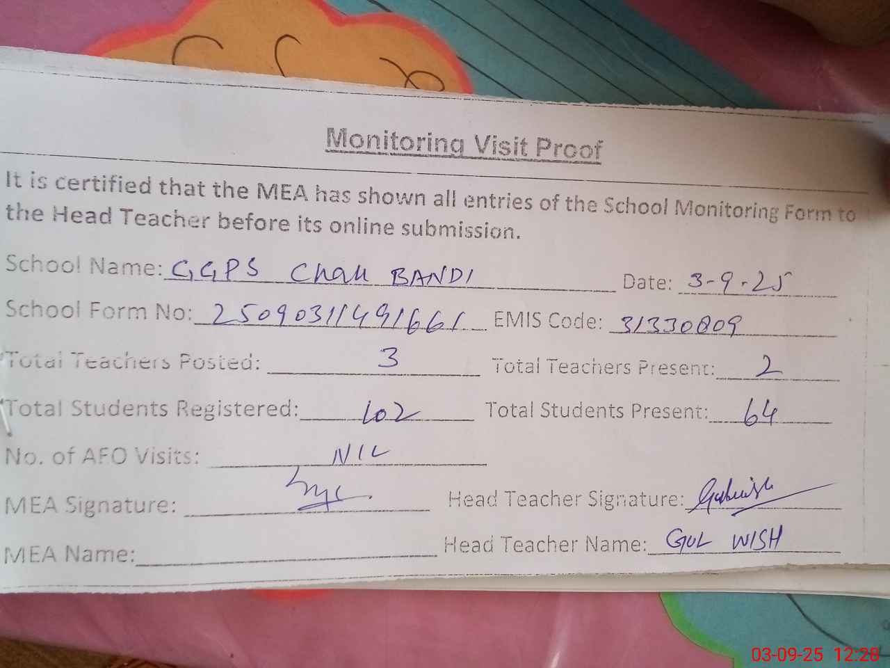 | Attendance Register | Head Teacher | MEA with School | Visit Proof |