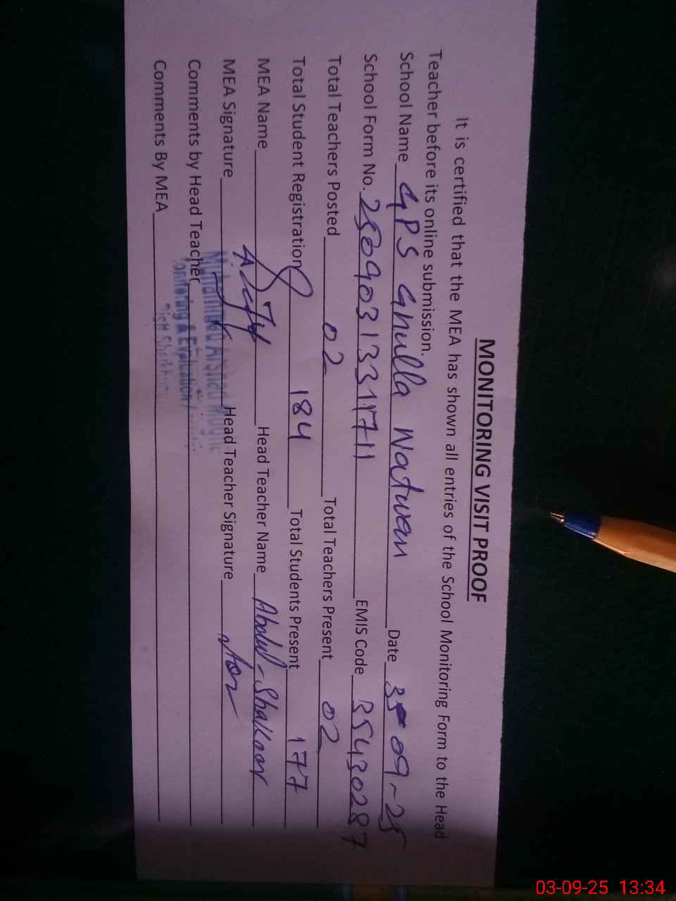 | Attendance Register | Head Teacher | MEA with School | Visit Proof |