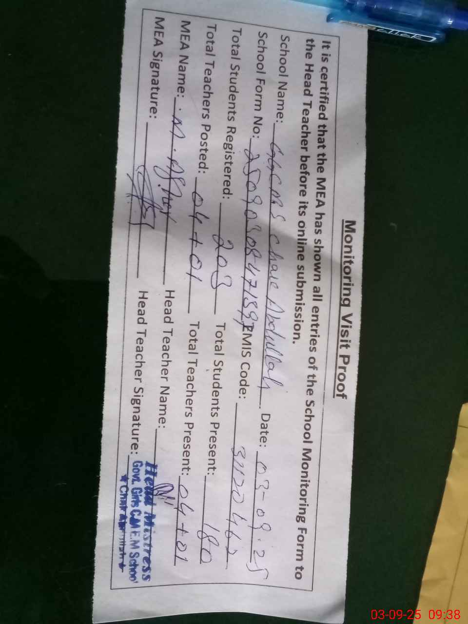 | Attendance Register | Head Teacher | MEA with School | Visit Proof |