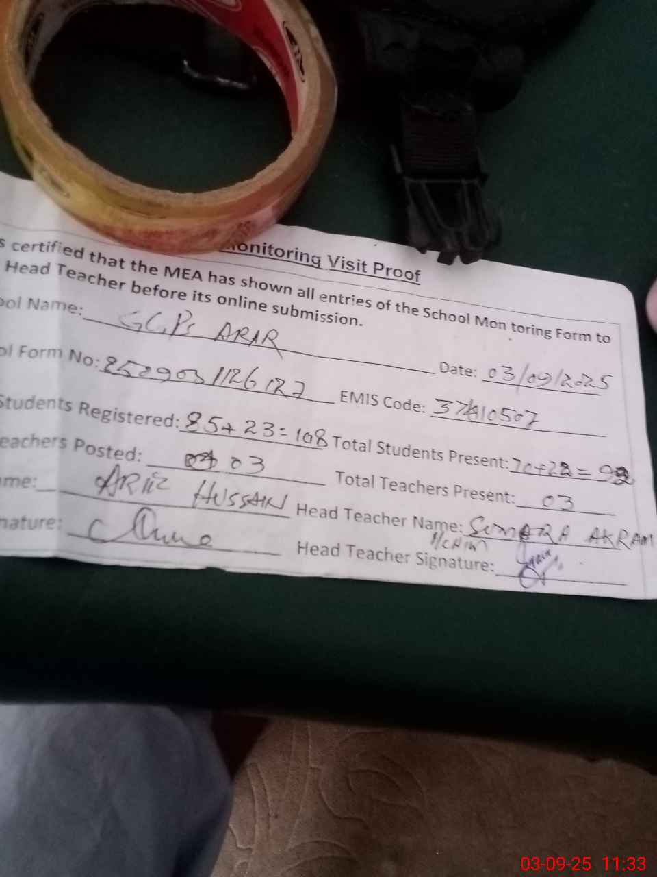 | Attendance Register | Head Teacher | MEA with School | Visit Proof |