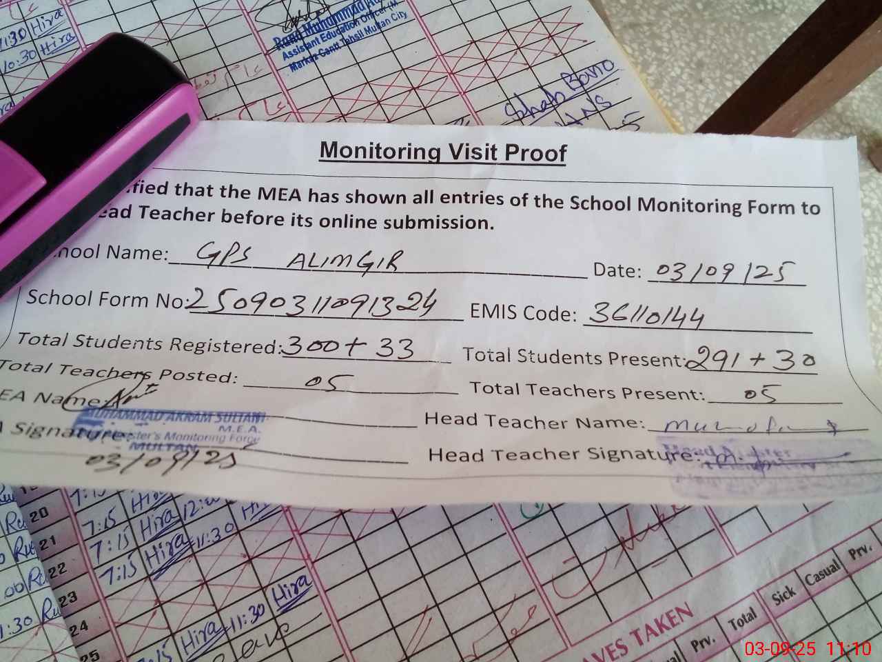 | EMIS Code: 36110144 | Name of School: GPS ALAM GIR MOUZA ALAMGIR TEH. DISTT. MULTAN | |||