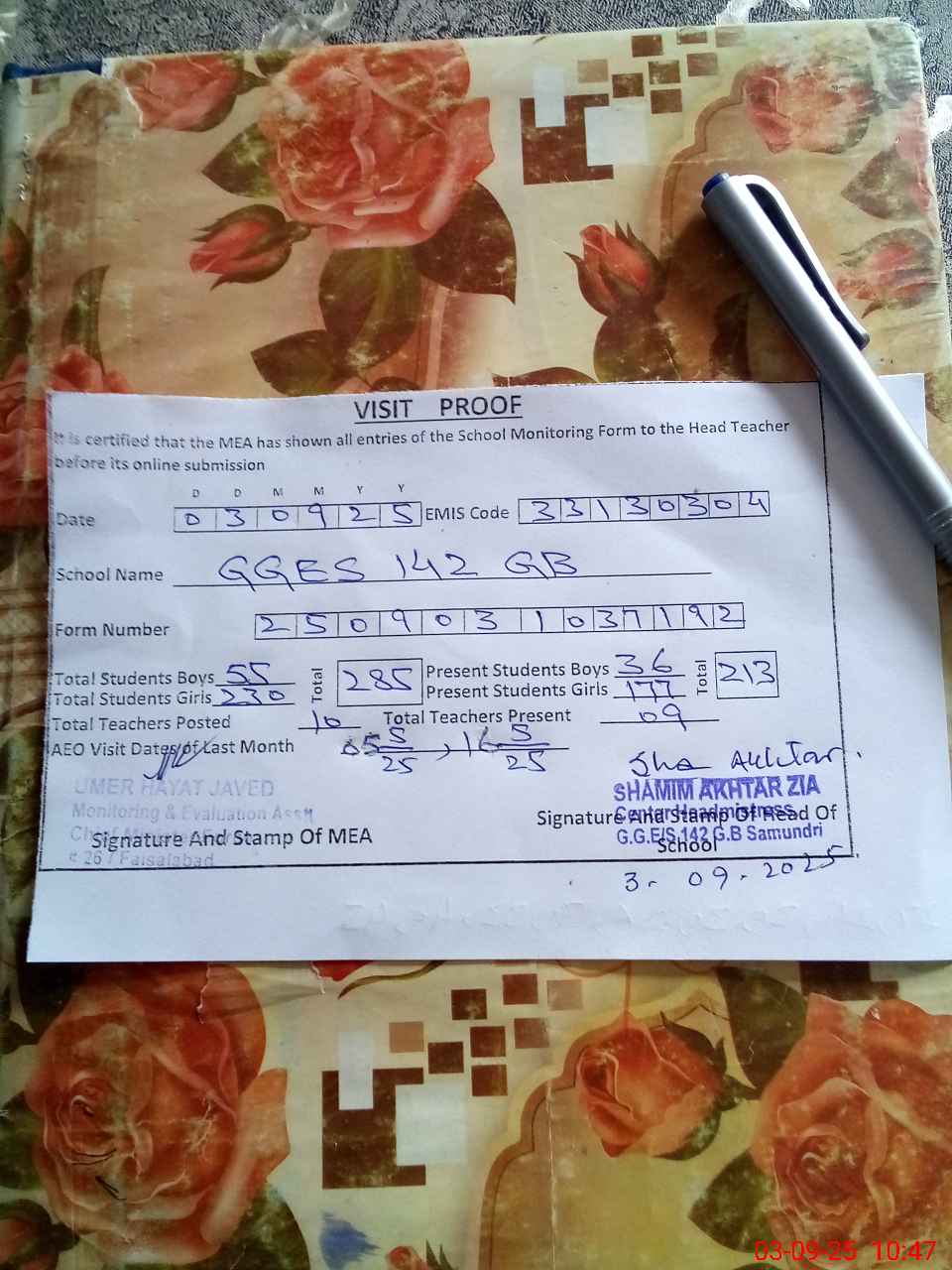 | EMIS Code: 33130304 | Name of School: GGHS CHAK NO 142 GB | |||