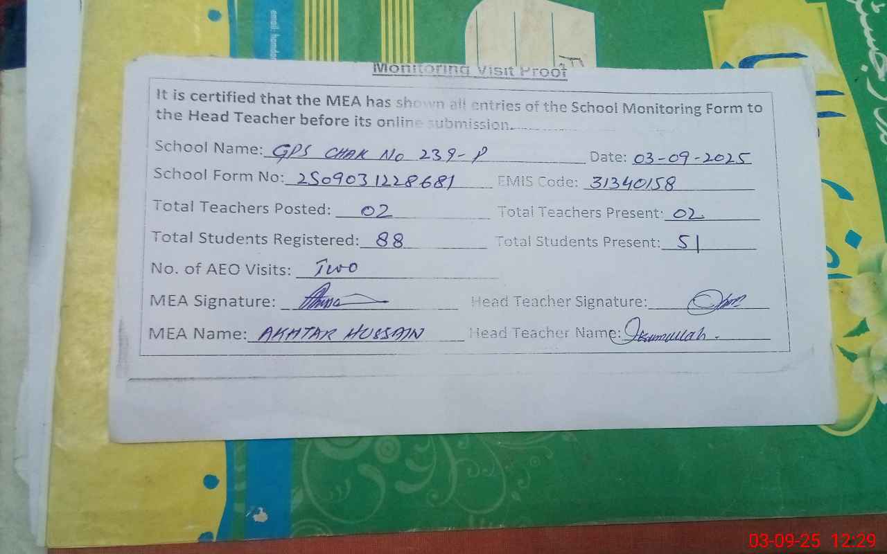 | EMIS Code: 31340158 | Name of School: GPS CHAK NO 239-P | |||