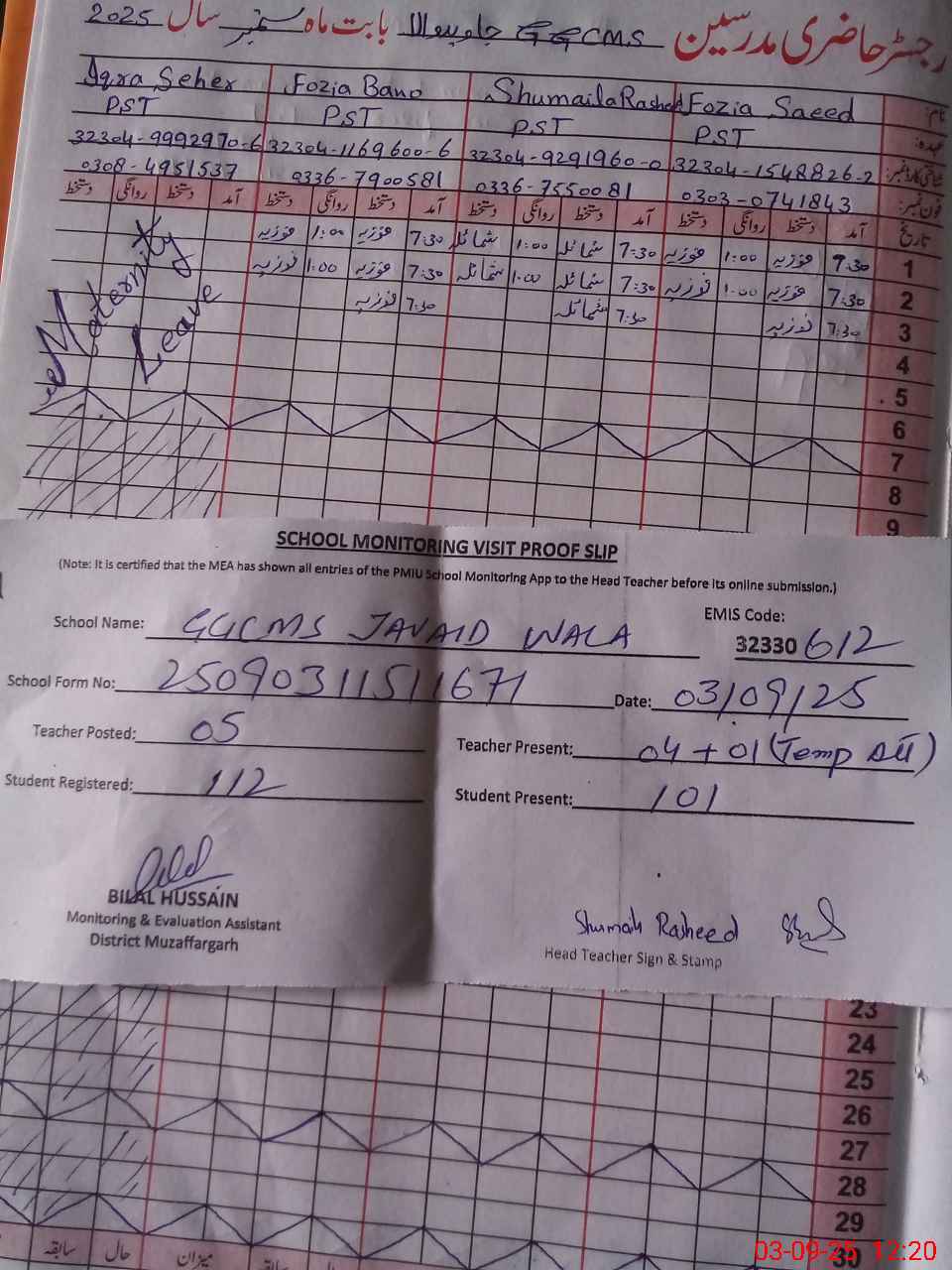 | Attendance Register | Head Teacher | MEA with School | Visit Proof |