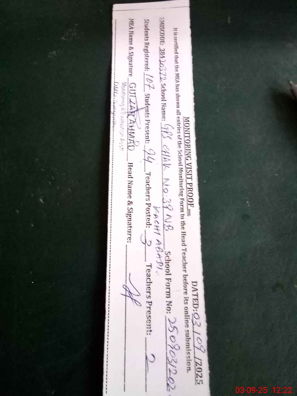 | Attendance Register | Head Teacher | MEA with School | Visit Proof |