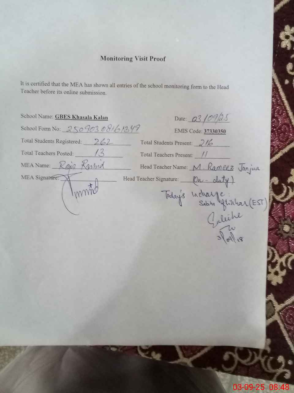 | Certified that this School was Inspected by the Undersigned MEA/DMO Today and the Information Stated Above is as Per Record. | |||||