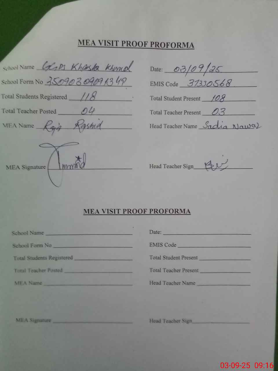 | Attendance Register | Head Teacher | MEA with School | Visit Proof |