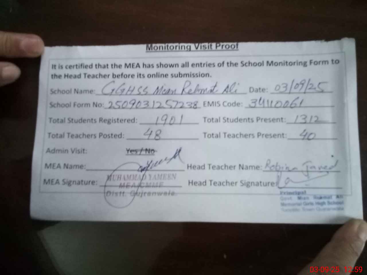 | Attendance Register | Head Teacher | MEA with School | Visit Proof |