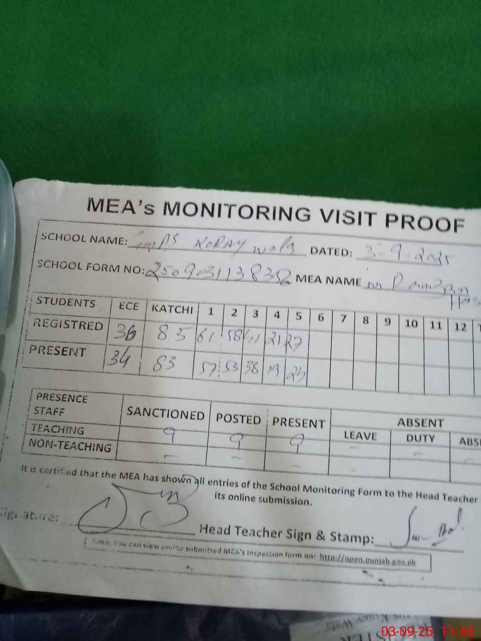 | Attendance Register | Head Teacher | MEA with School | Visit Proof |