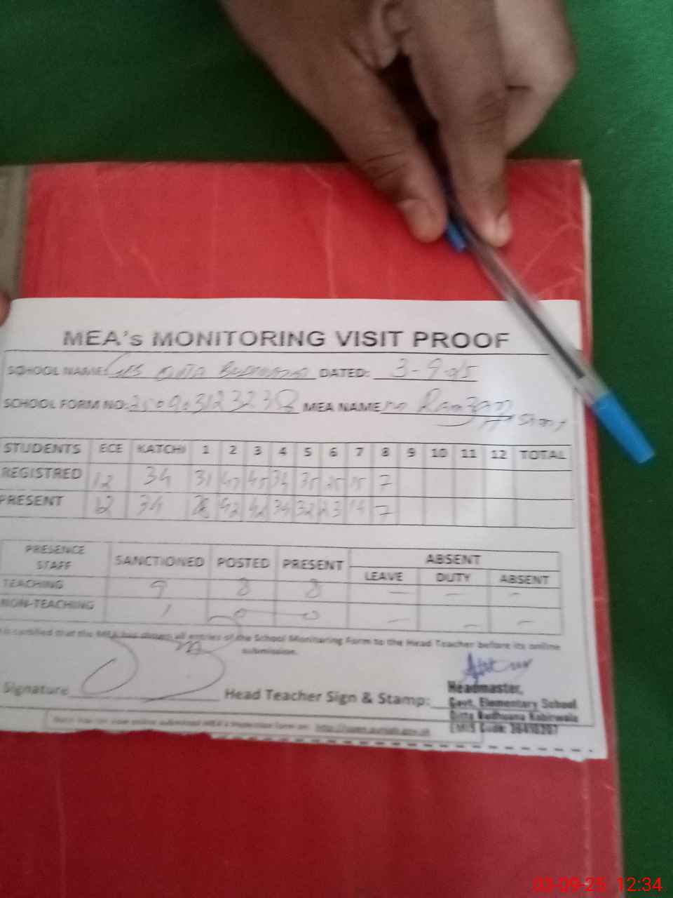 | Attendance Register | Head Teacher | MEA with School | Visit Proof |