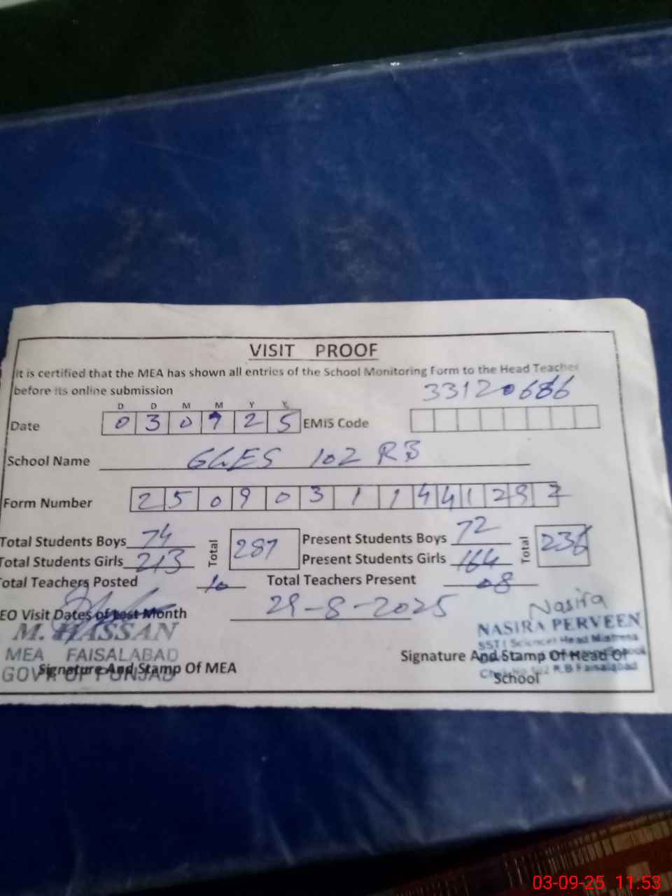 | Attendance Register | Head Teacher | MEA with School | Visit Proof |