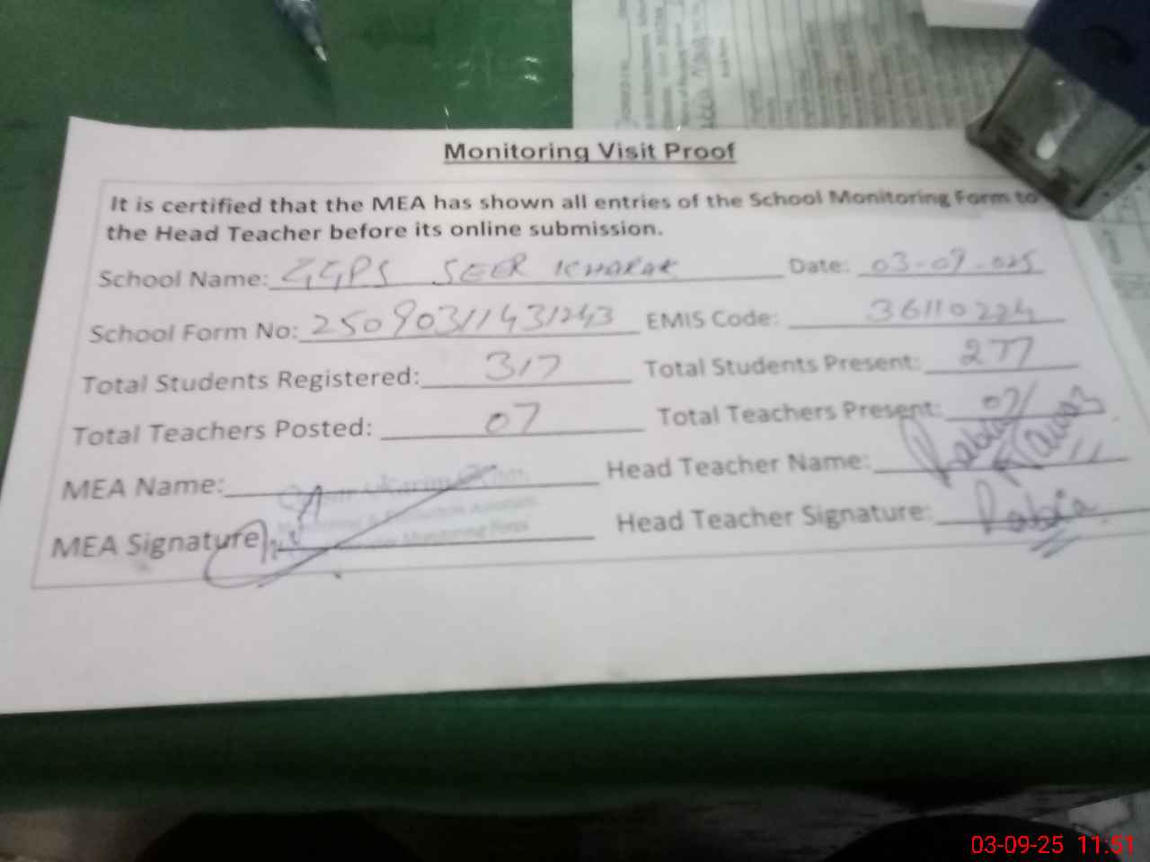 | Attendance Register | Head Teacher | MEA with School | Visit Proof |