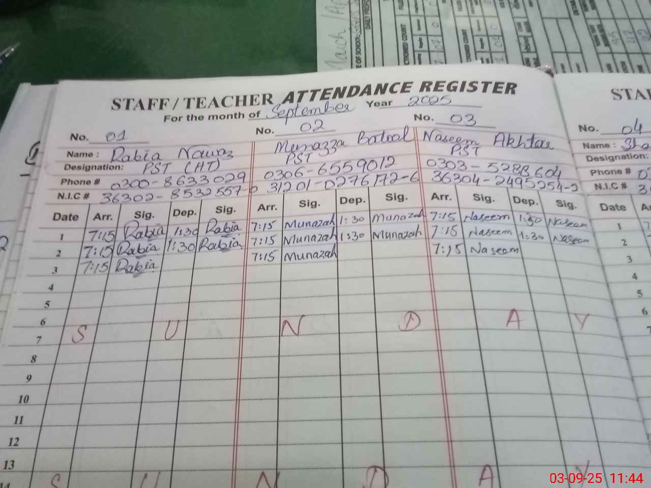 | CNIC | Full Name | Designation | R/C | Absence During Last Calender Month |