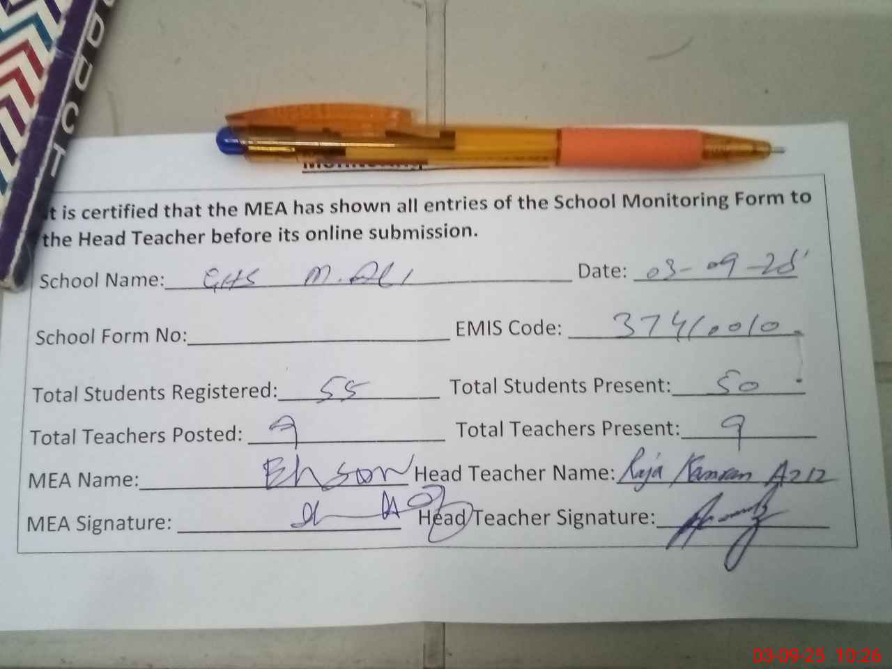 | Attendance Register | Head Teacher | MEA with School | Visit Proof |