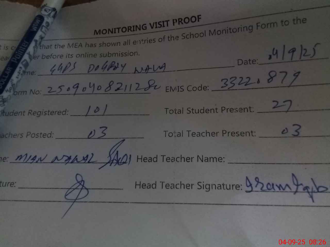 | Attendance Register | Head Teacher | MEA with School | Visit Proof |