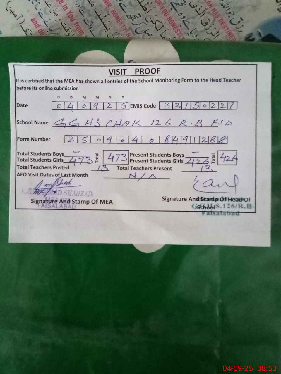 | EMIS Code: 33150227 | Name of School: GGHS CHAK 126 RB FSD | |||