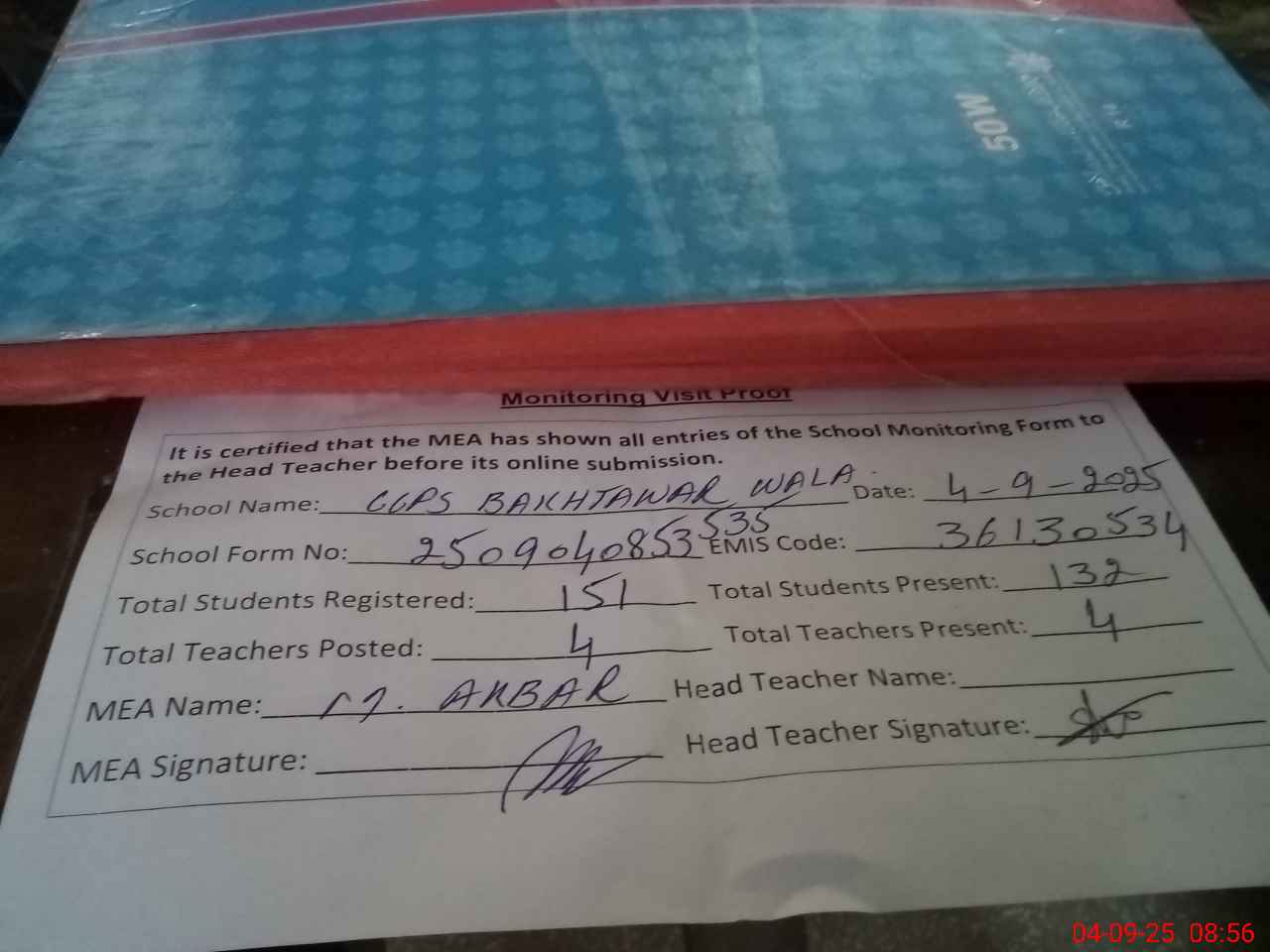 | Attendance Register | Head Teacher | MEA with School | Visit Proof |