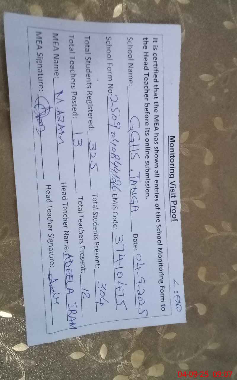 | EMIS Code: 37410475 | Name of School: GGHS JANGA | |||