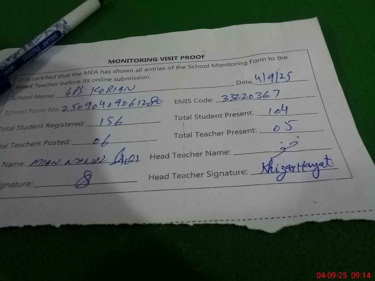 | Attendance Register | Head Teacher | MEA with School | Visit Proof |