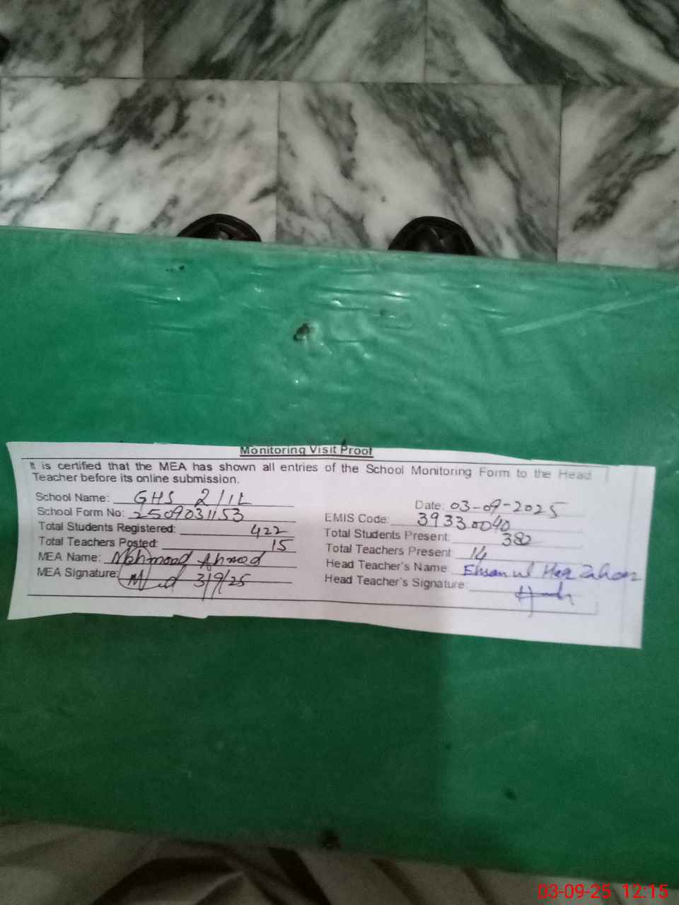 | Attendance Register | Head Teacher | MEA with School | Visit Proof |