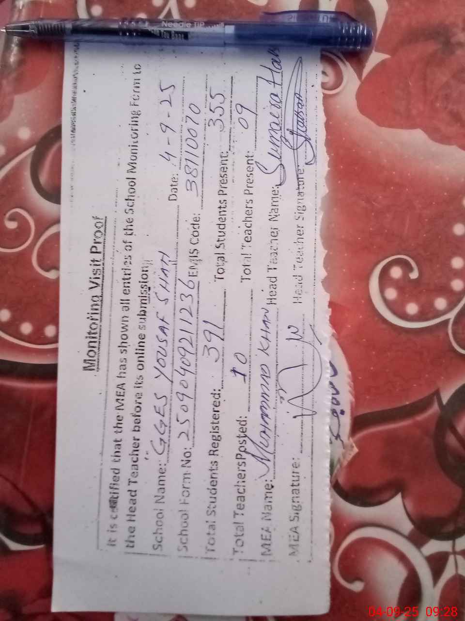 | Attendance Register | Head Teacher | MEA with School | Visit Proof |