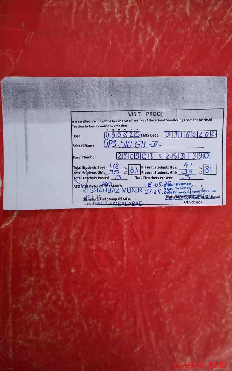| EMIS Code: 33160202 | Name of School: GPS CHAK 510 GB II MAMUNKANJAN | |||