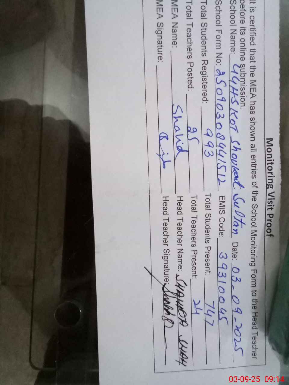 | Attendance Register | Head Teacher | MEA with School | Visit Proof |